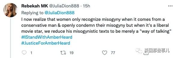 但当他们听到德普称他的妻子为‘婊子、荡妇、毫无用处的人’时,这些女孩就说:‘他听起来像个南方的绅士’,‘她就应该被这么称呼’。