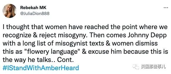 我以为女性已经到了知道什么是厌女,拒绝厌女的程度。然后,德普带着一长串厌女的文字来了,女人们将那看作是‘花言巧语’,原谅了他,因为这就是他说话的方式。