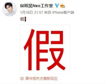 对比一下,前两天有传闻说郑爽和侯明昊在一起了,侯明昊工作室立刻发了一个明确的辟谣:假!