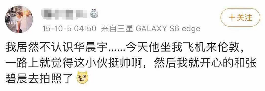 2015年10月,有网友偶遇了华晨宇和张碧晨一起坐飞机。