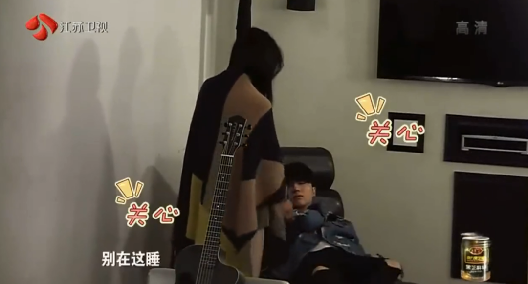 有次华晨宇身体不舒服,倒在旁边,张碧晨上前关心,要不上楼躺着吧,别在这睡。