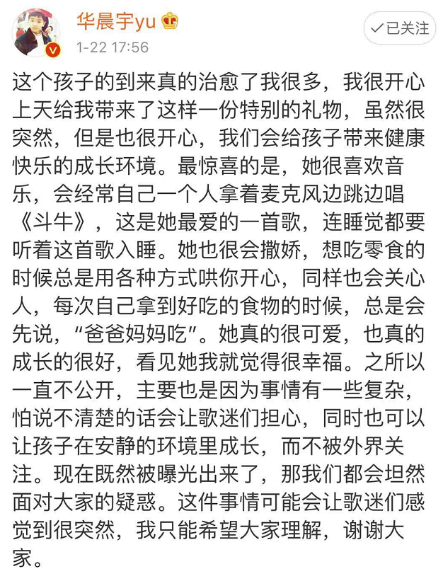 华晨宇是个好爸爸,说过很遗憾没能陪她度过孕期的话,两人商量之下,给孩子落了户口。