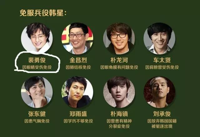 懂小姐在查阅资料后得知,裴勇俊是由于眼睛受伤开刀,视力不符合标准而免服兵役的。据说,他外表斯文,但少年时期却非常好动,眼睛就是在与人打斗中被踢伤的,而且术后视力也未恢复,因此不需要服兵役,只需要服国民役。