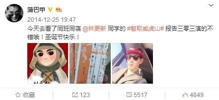 这两人不但同班,而且还同寝,私交也不错,几年前林更新的电影《智取威虎山》上映时,蒲巴甲还在微博里支持过。
