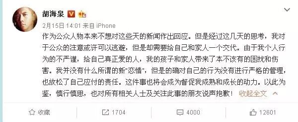 作为公众人物本来不想对这些天的新闻作出回应。但是经过这几天的思考,我对于公众的注意或许可以逃避,但是却需要给自己和家人一个交代。由于我个人行为的不严谨,给自己真正爱的人,我的孩子和家人带来了本不该有的困扰和伤害。我并没有什么所谓的新“恋情”,但是的确对自己的行为没有进行严格的管理,也放松了自己应付的责任。这件事也将会成为督促我成熟和成长的动力。以此为鉴,慎行慎思,也对所有相关人士及关注此事的朋友说声抱歉!