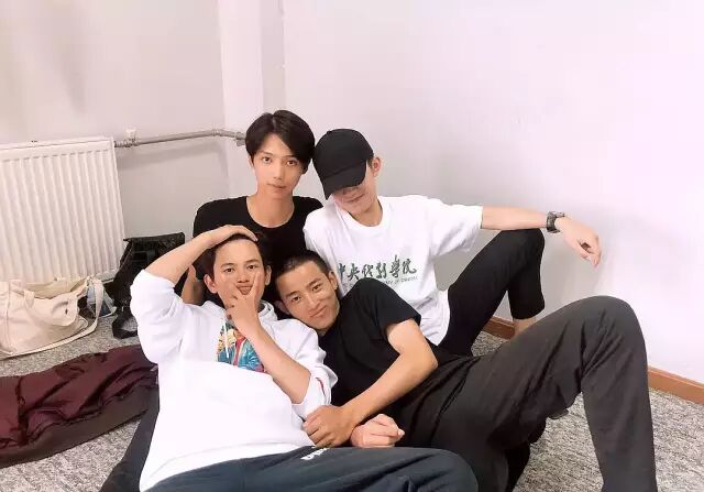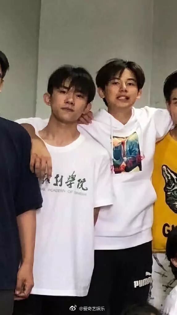 他们穿着印有“中央戏剧学院”的校园文化衫,同宿舍的易烊千玺和胡先煦紧挨在一起,小胡一会儿揽着千玺的肩;