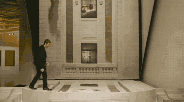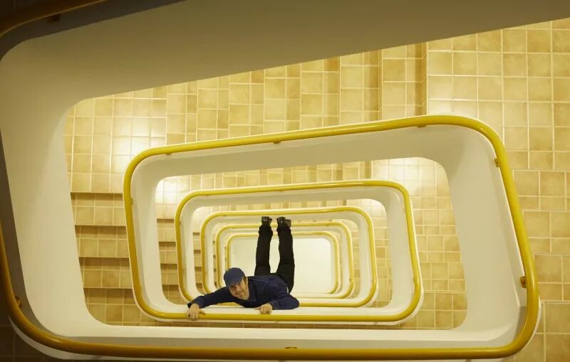 真相:整个楼梯其实是平放的,并不是垂直的哦。观众可以从侧面进入楼梯,手抓住护栏,双腿扑腾,戏精们的表演又开始了!