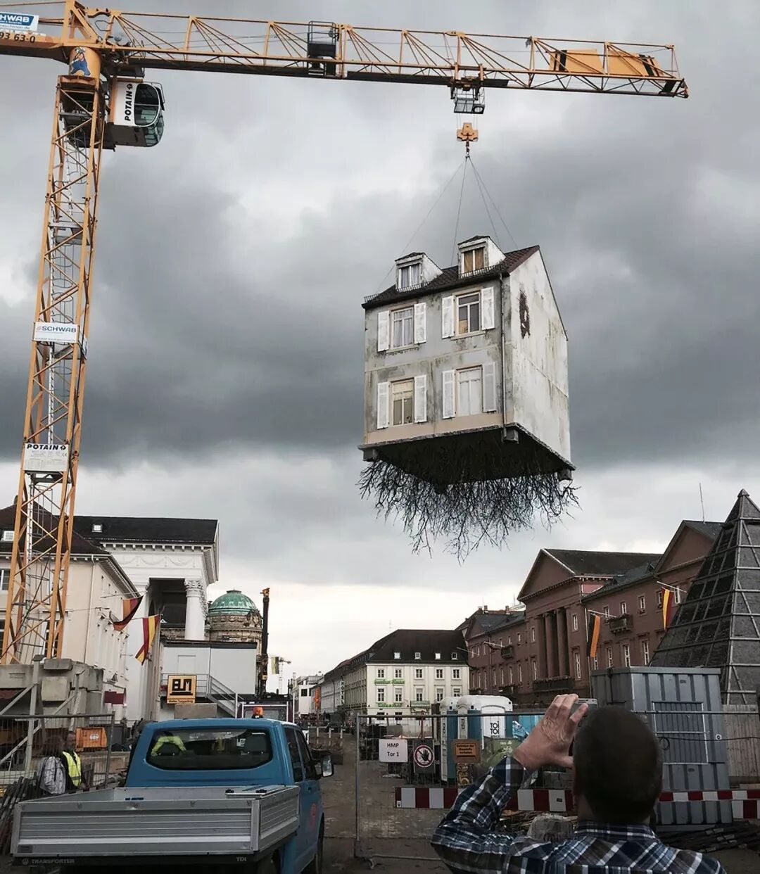 在大街上,他用起重机吊起一座房子,把房子连根拔起!他觉得房子是人的记忆载体,在城市里扎根,强行的拆迁,就像连根拔起一样。