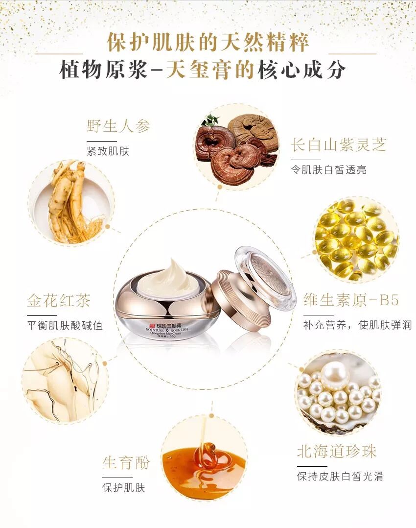 延续1300多年前唐朝宫廷美容御方-天玺膏,它含有(琼珍)灵芝主要成份-灵芝多糖多肽能使人皮肤延迟衰老,紧致白透。那时可谓是供奉贵妃皇后们最为珍贵的宝物,它造就了皇后们不施脂粉,亦可生辉,高雅清丽的面容!