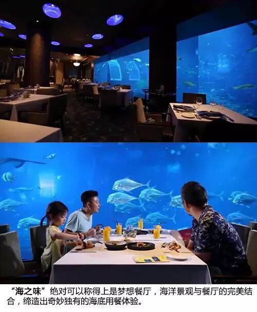 来到了海洋餐厅,你是不是讶异于眼前的景象呢?在享受美食的同时,各种鱼类就在周围游来游去。