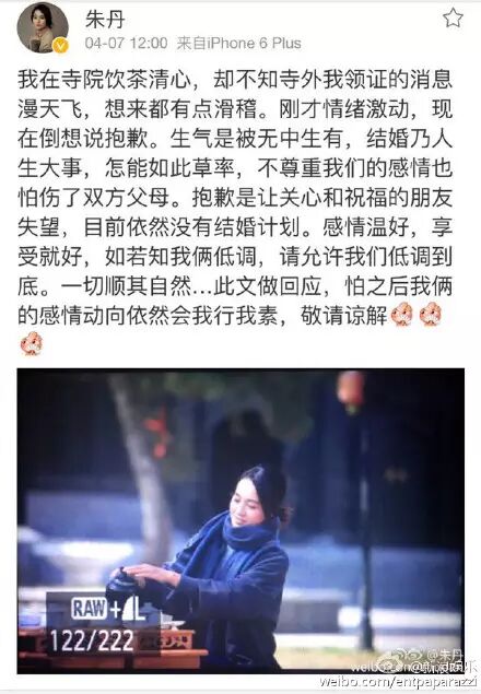 今天中午12点朱丹微博说:我在寺院饮茶清心,却不知寺外我领证的消息漫天飞,想来都有点滑稽。刚才情绪激动,现在倒想说抱歉。生气是被无中生有,结婚乃人生大事,怎能如此草率,不尊重我们的感情也怕伤了双方父母。抱歉是让关心和祝福的朋友失望,目前依然没有结婚计划。感情温好,享受就好,如若知我俩低调,请允许我们低调到底。一切顺其自然…此文做回应,怕之后我俩的感情动向依然会我行我素,敬请谅解。