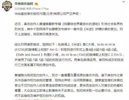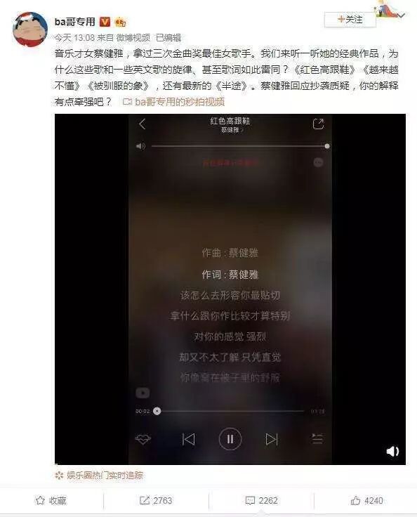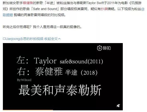 引发网友对蔡健雅的多年作品进行diss,缘起是蔡健雅的新专辑《我要给世界最悠长的湿吻》中的一首《半途》被质疑抄袭泰勒·斯威夫特的《safe&sound》。有网友将蔡健雅的众多经典歌曲截取相关片段,与被“抄袭”的歌曲重合播放,并配文:“蔡健雅不愧是金曲歌后,抄都选最经典的作品,而且抄袭的走向就像风一样捉摸不住......收好你的新专辑,收好你的半途,回家给你闭眼吹粉丝听去吧!”