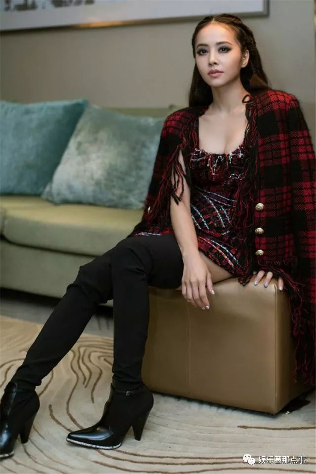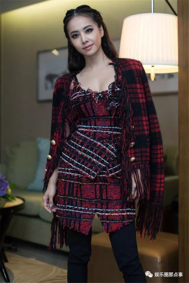 有网友说这一身红色格子衫连衣裙很像一个地毯,带着一点流苏的设计,特别能呈现出她的美感,时尚而精致,脚上一双黑色的过膝长靴,能很好的呈现出她的时尚感。