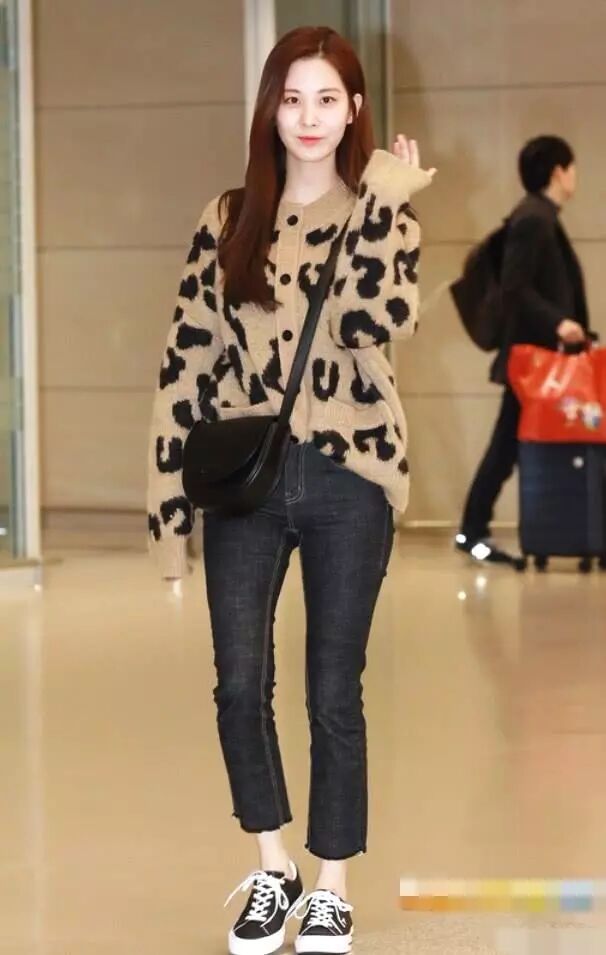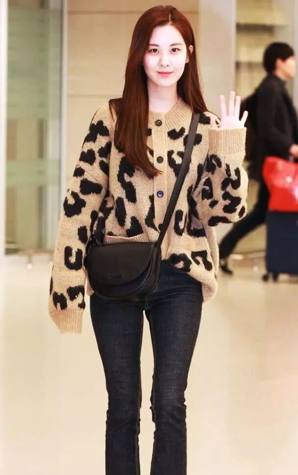 学徐珠贤开衫+牛仔裤,让你清新又时尚,她穿了件奶茶色的针织开衫,还是奶牛团队的款式,看起来清新甜美,色调上也显得比较温和,下搭一条黑色牛仔裤,简简单单的穿搭,却也不失时尚气息!