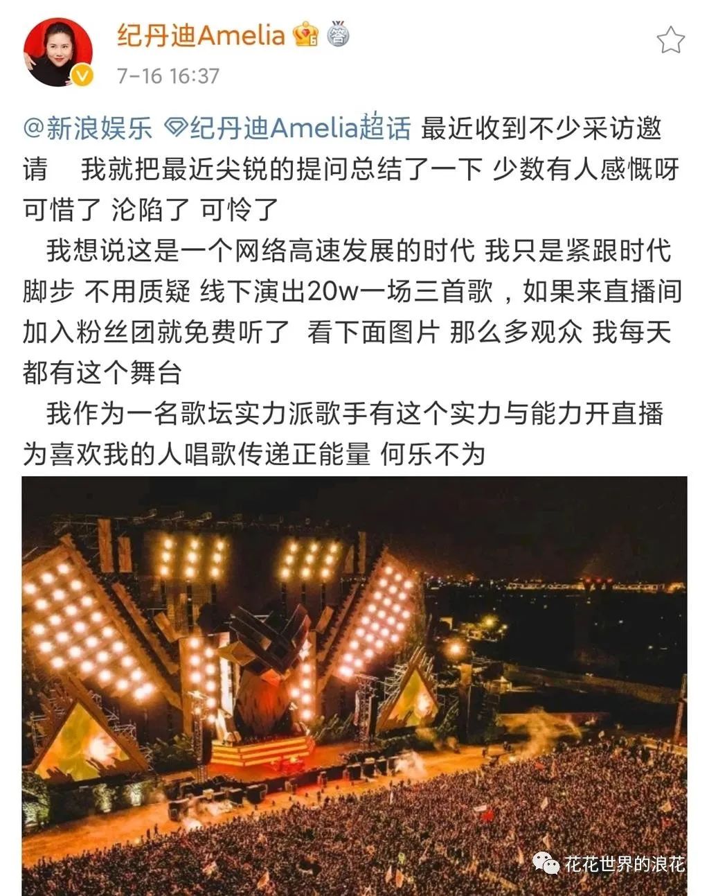 她显露本人只是紧跟期间脚步,线下一场表演3首歌的表演费20万,但在直播间进入粉丝团便不收费听。纪敏佳还配了一张大型表演的图片,显露本人(经历直播)每天都能够有辣么多观众的舞台。并且现实上经历纪敏佳以往的动静来看,固然她每每直播,但仍然会有少许线下的表演举止。在发文中纪敏佳自称歌坛气力派歌手,她显露本人有气力和才气开直播为稀饭她的人唱歌相传正能量,迫不得已?可见她对当下的状况实在挺写意,并不会自伤自怜,反倒是网友大概太甚敏感。