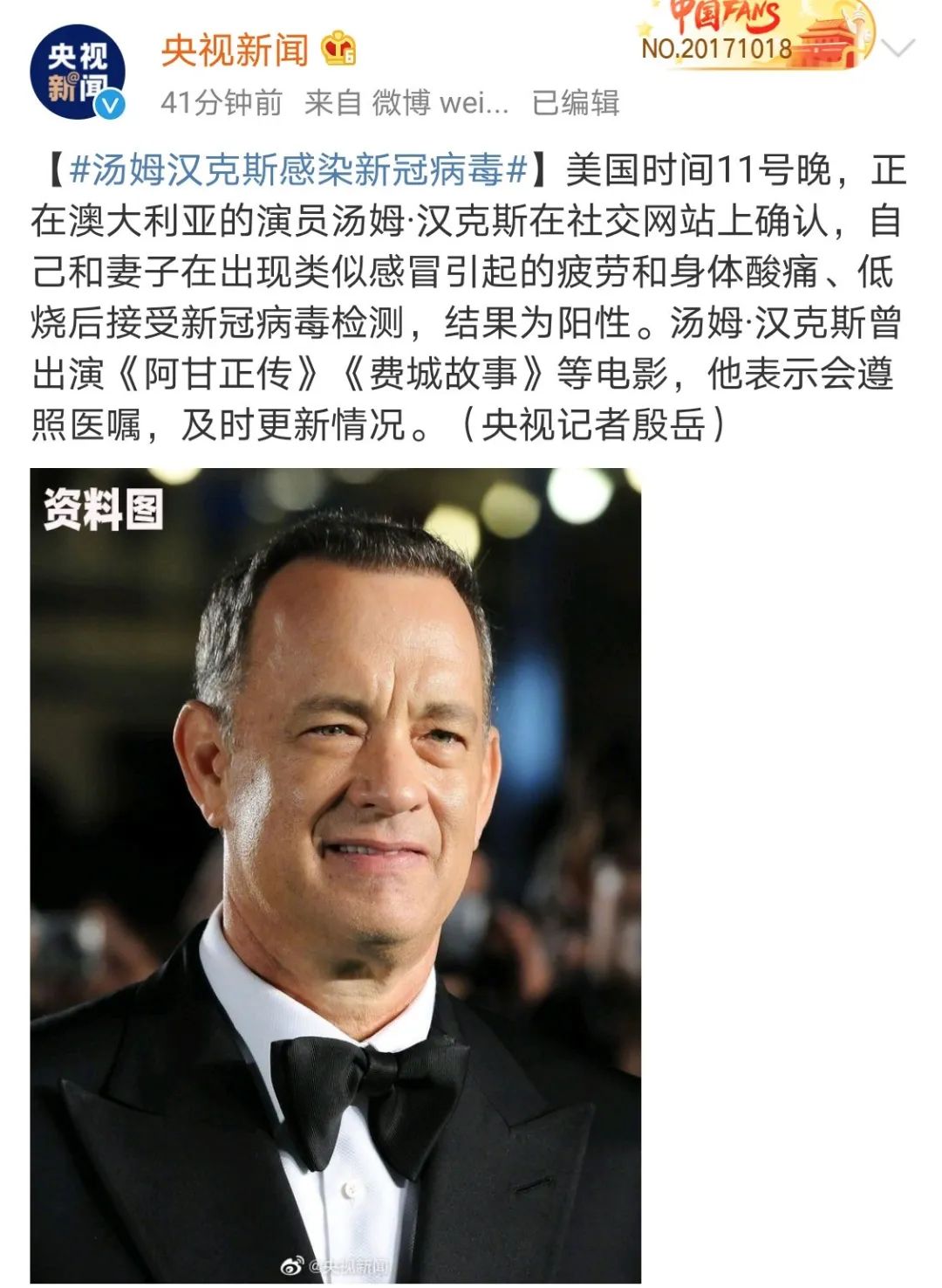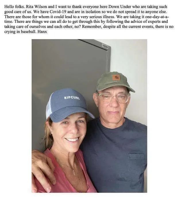 不用过于为他们担心,父母确实感染了新冠,这太疯狂了。现在两位老人还在澳大利亚,因为爸爸要在那拍摄关于猫王埃尔维斯·普雷斯利的电影。切特·汉克斯说我刚给他们打了电话,他们身体状况都还好(fine),病情不是那么严重,父母本人也不担心,没有乱象什么,但他们在进行必要的健康措施,我认为不需要太过担心。最后他也感激了大家的关心和祝愿,我想都会好起来的,希望大家注意安全。