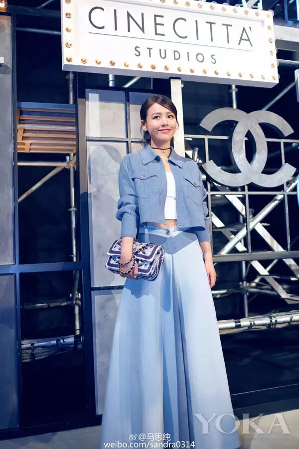 马思纯身着Chanel 2016春夏系列蓝色牛仔外套搭配拼色牛仔长裙,清新大方,俏皮中不失优雅。