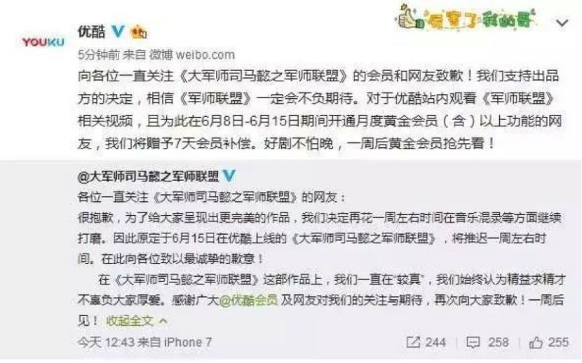 情况大抵相似的还有去年播出的《军师联盟》,他的战况又如何?该剧原本是要先于江苏卫视和安徽卫视7天上线,但因卫视的阻挠,最终只能同一天上线。优酷6月22日零点上线,而江苏卫视与安徽卫视于6月22日晚上19:30开播;到了第二部,《虎啸龙吟》则直接在优酷独家上线,未能上星。