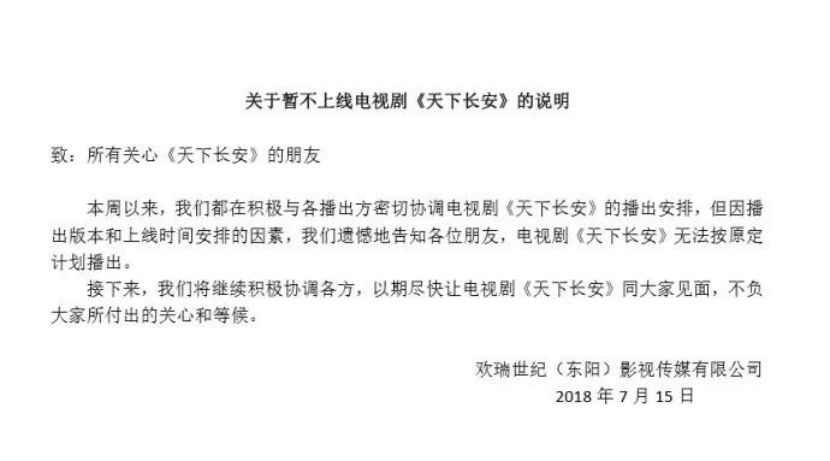 随后,网络上便有大量相关新闻报道《天下长安》突遭撤档。几个小时后,该剧出品方之一欢瑞世纪便发表声明,称“因播出版本和上线时间安排”导致该剧无法与观众如期而至,至于何时能够重新上线,官方并未给出具体声明。