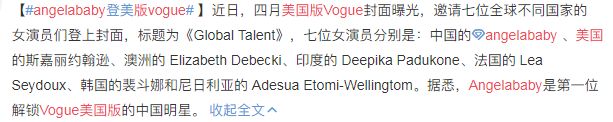 杨颖登上了vogue美国版封面,是第一位解锁该杂志封面的中国明星。