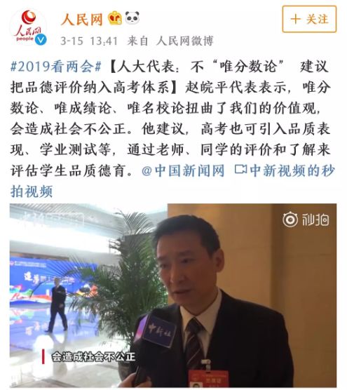 转发的微博内容是有代表提议不要“唯成绩论”,高考也可以引入品质表现和学业测试等方面,以免造成社会不公正。