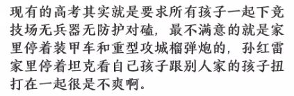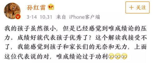 其实在扒爷看来,这也不是孙红雷单人的问题,说白了就是阶层生活水平不同导致了观点不同,往大了说这就是教育一直存在的矛盾,大家一直在试图寻找解决矛盾的方法,只不过不太容易找到。所以这回他挨喷,就是因为他站出来发言成了矛盾集中的火力点。