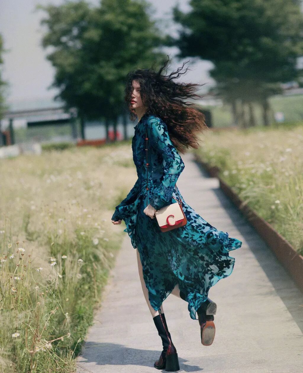 ▲何穗身穿不对称裙摆印花长裙,搭配短靴,自由烂漫的民族风溢出屏幕。