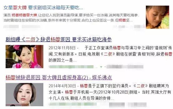 几天后,《二叔》导演发文称开除杨蓉是因为她“耍大牌”,要求剧组给她配备冰箱,每天都要吃海参。
