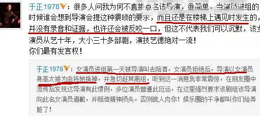 2012年,杨蓉进入《二叔》剧组3天,于正就发文表示并称该剧组导演要求杨蓉“陪酒”被拒,随后换掉了杨蓉。