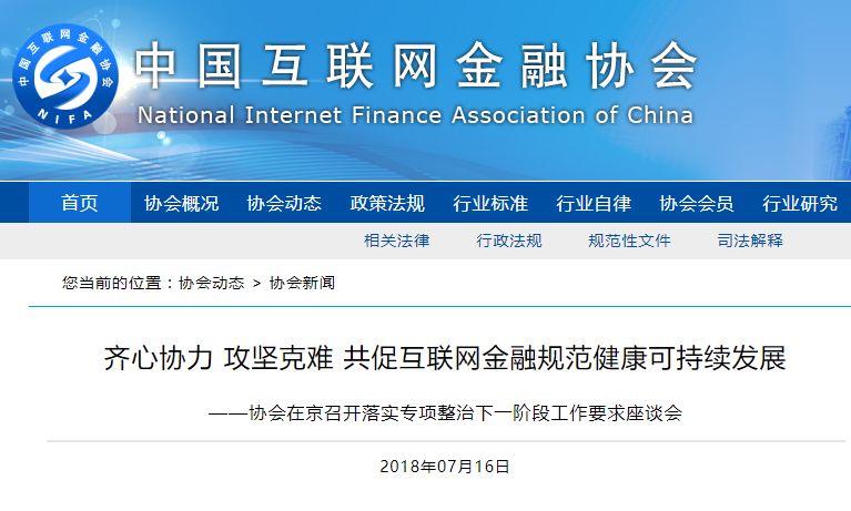 7月16日晚10时许,中国互联网金融协会在其官方媒体发表了题为《齐心协力 攻坚克难 共促互联网金融规范健康可持续发展——协会在京召开落实专项整治下一阶段工作要求座谈会》的文章。