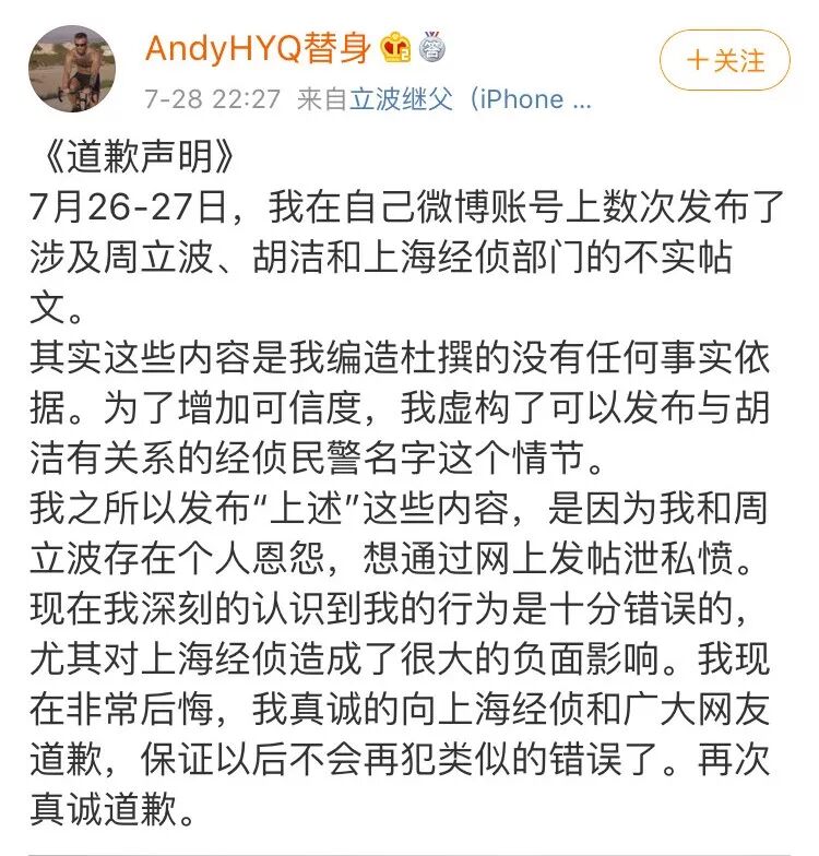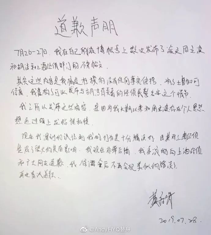 就在警方通报前16分钟,网民“@andyHYQ替身”也通过新浪微博发帖致歉,内容如下: