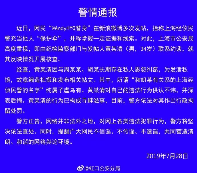 昨晚(28日)22:43,上海市公安局虹口分局官方微博通报称,近日,网民“@AndyHYQ替身”在新浪微博多次发帖,指称上海经侦民警充当他人“保护伞”,并称掌握一定证据和线索。对此,上海市公安局高度重视,即由纪检监察部门与发帖人黄某清(男,34岁)联系约谈,就其反映情况开展核查。