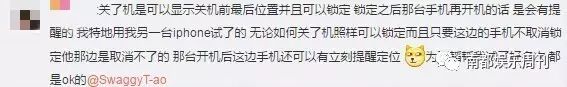 还有网友为黄子韬支招,“关了机是可以显示关机前最后位置并且可以锁定,锁定之后那台手机再开机的话,是会有提醒的,特地用另一台iphone试了的。无论如何关了机照样可以锁定,而且只要这边的手机不取消锁定他那边是取消不了的,那台开机后这边手机还可以有立刻提醒定位”。