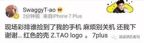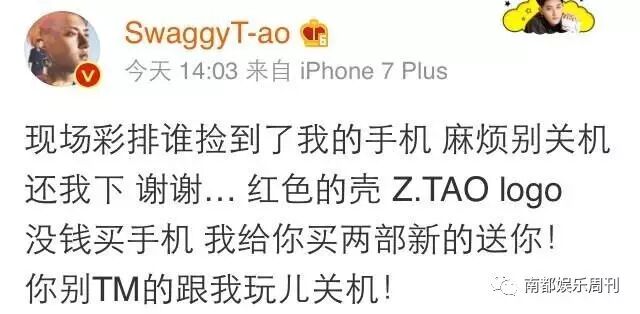 黄子韬写道“现场彩排谁捡到了我的手机,麻烦别关机,还我下谢谢…红色的壳,Z.TAO logo没钱买手机我给你买两部新的送你!你别TM跟我玩儿关机!”