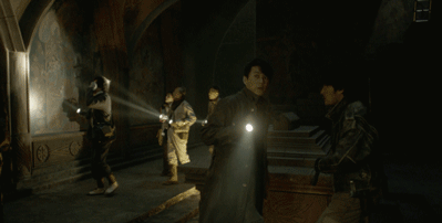 大家都像探险一样走进洞里,耳边还一直响着阴森森的恐怖音乐…