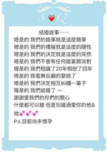不仅如此,二人还表示:不会有任何婚宴跟派对,而且,舒淇现在尚未怀孕。