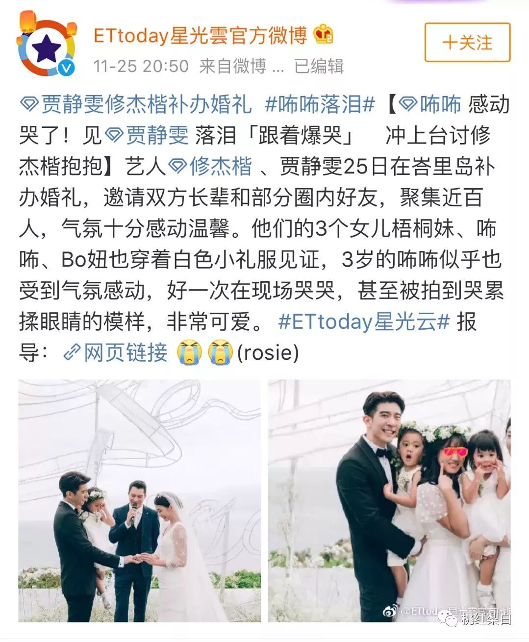 上周末,贾静雯跟修杰楷在巴厘岛补办了婚礼。