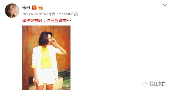 俩人公布恋情时,朱丹更新微博:“遥望终有时,你已近眼前”,看似默认恋情。