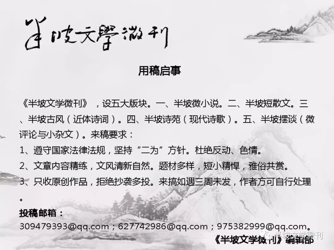 声明:投稿须为作者原创。若在报刊杂志公开发表过的稿件请注明出处,并且没有在其他微刊(公众平台)发表过。严禁抄袭、侵权,文责自负,本微信公众平台不承担任何连带责任。一经发现抄袭者或者一稿多投者,将会被列入黑名单。