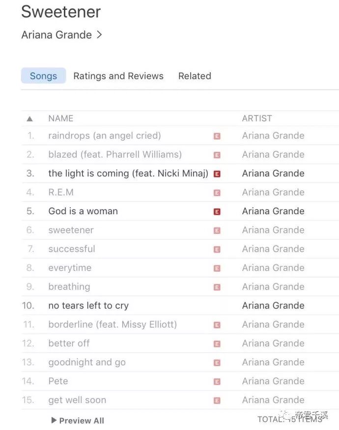 共收录15首曲目的新专辑,多元风格惊艳入耳。首支Pop热单“No Tears Left To Cry”惊艳入耳。首支Pop热单“No Tears Left To Cry”惊现Ariana圣歌般的天使之嗓,回归之际席卷88国iTunes冠军席位,登上公告牌单曲榜第3位,分别凭借过百万及六十万销量在美国,英国摘得“白金唱片”认证。目前,在澳大利亚,加拿大,巴西更是加印“双白金唱片”印记,而新西兰,比利时,丹麦等6国均也收获“金唱片”销量认证。