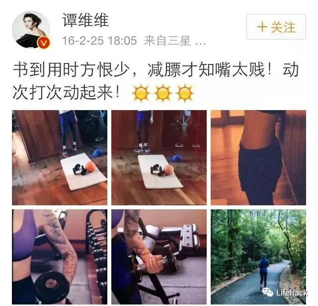 翻一翻她的朋友圈你会感觉,谭维维仿佛就是一位被唱歌耽误了的健身教练,平时晒的最多的除了工作就是跟举铁相关的,俨然已经上了道并且成长为健身界的杠把子!