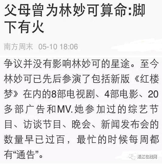 南方周末曾报道,林爸林妈找人给林妙可算过命,相士说她会比章子怡更火。因此在奥运之前,林妈妈已经给女儿接了不少广告和拍戏机会,让孩子早早进入娱乐圈。