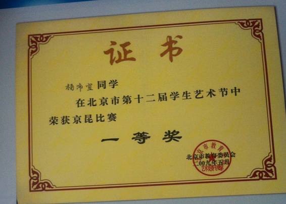 在北京市第十二届学生艺术节中获京昆比赛一等奖;