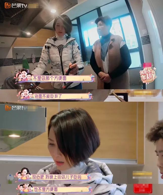 煮着面,婆婆就忍不住叮嘱“方便面可不能吃多”,蔡少芬立马回答“我是不会给你儿子吃泡面的”。言语间都是妈妈把儿子交给另一个女人照顾的不放心。