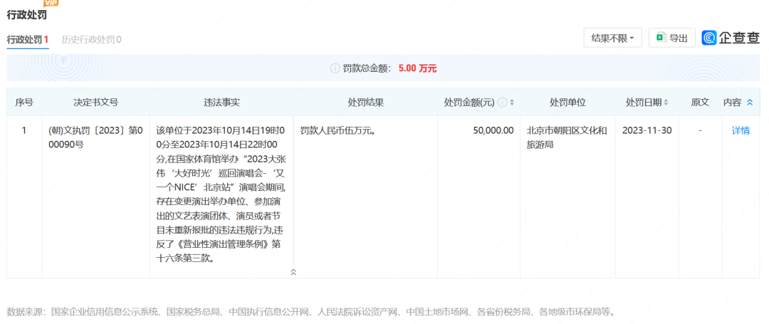 处罚事由显示,该单位在10月14日晚举办“2023大张伟‘大好时光’巡回演唱会—‘又一个NICE’北京站”演唱会期间,存在变更演出举办单位、参加演出的文艺表演团体、演员或者节目未重新报批的违法违规行为,违反《营业性演出管理条例》。