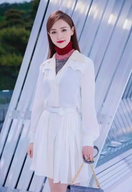 唐嫣白裙+渐变毛衣,皮肤白到发光