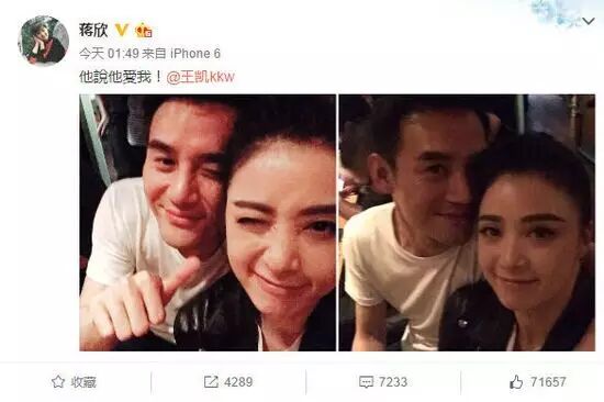 甜蜜蜜,你笑的甜蜜蜜~蒋欣昨日凌晨在微博上晒出和王凯的合照,并配文:“他说他爱我!@王凯kkw”。照片中两人亲密依偎,互相贴脸,十分暧昧。