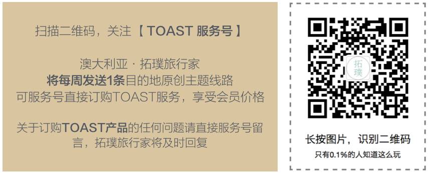 长按二维码,关注 TOAST 服务号,更多精美行程等着你~