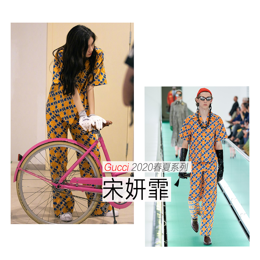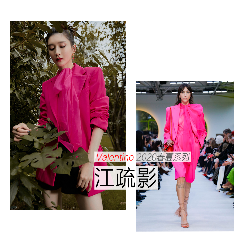以“灰色彩绘法”(Grisaille)为灵感的这一季Valentino,用了大量明亮和浓烈的荧光色,但是和街头风没有什么关系。右边的“卖家秀”是律政佳人,左边江疏影的买家秀是精英戏大女主。