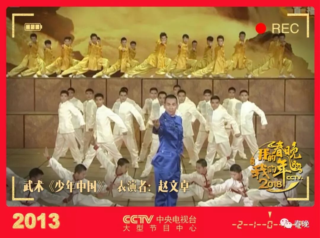 为国家筑梦不仅有民族英雄,还有我们的中国少年。著名影视功夫明星赵文卓与塔沟少林小子联袂出演武术《少年中国》这是赵文卓出道21年首次登上央视春晚的舞台,也是首次与塔沟少林小子合作演出。功夫小子们将艺术与武术相结合,充分展示了集体拳术、人体飞檐走壁等功夫,大气雄浑,振奋人心,不仅让观众一饱眼福,也画出了一百多年来中国少年朝气蓬勃、自强自立,为争取民族独立和国家富强而不断探索奋斗的不朽风采。
